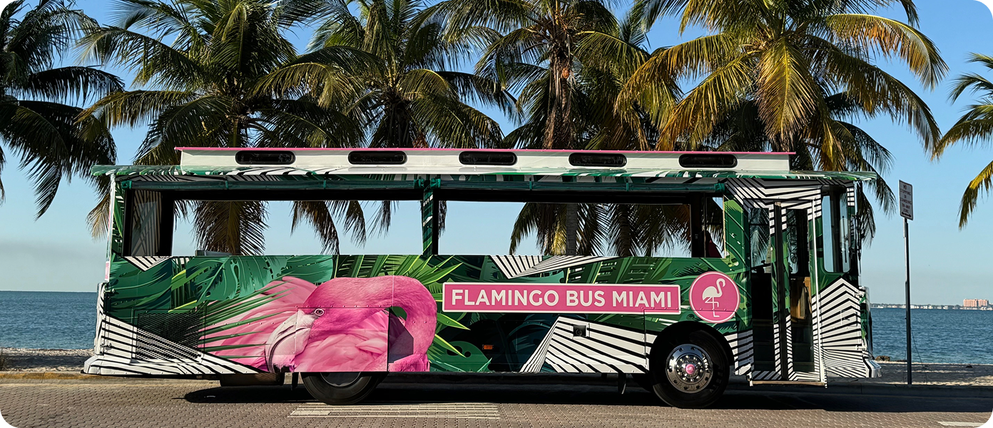 Flamingo Bus Miami Tours is the only all-American open-air trolley in the city. With 80s music, a live guide, and a VIP stop at the world-famous Sanguich, it’s a unique Miami experience that feels fun and personal.